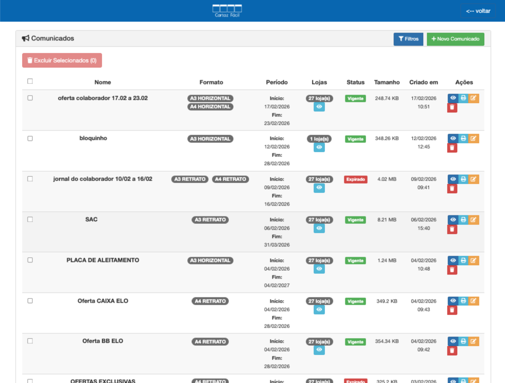 Importe arquivos em PNG, JPG e PDF e gerencie a dinâmica de envio dos comunicados, garantindo padronização e comunicação correta em todas as lojas.