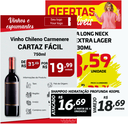 Com diversos modelos e formatos ilimitados, crie e desenvolva qualquer cartaz para sua loja para qualquer oferta. Crie seus temas diretamente do sistema Cartaz Fácil, configure suas cores, insira seu logo e mantenha sua identidade visual.